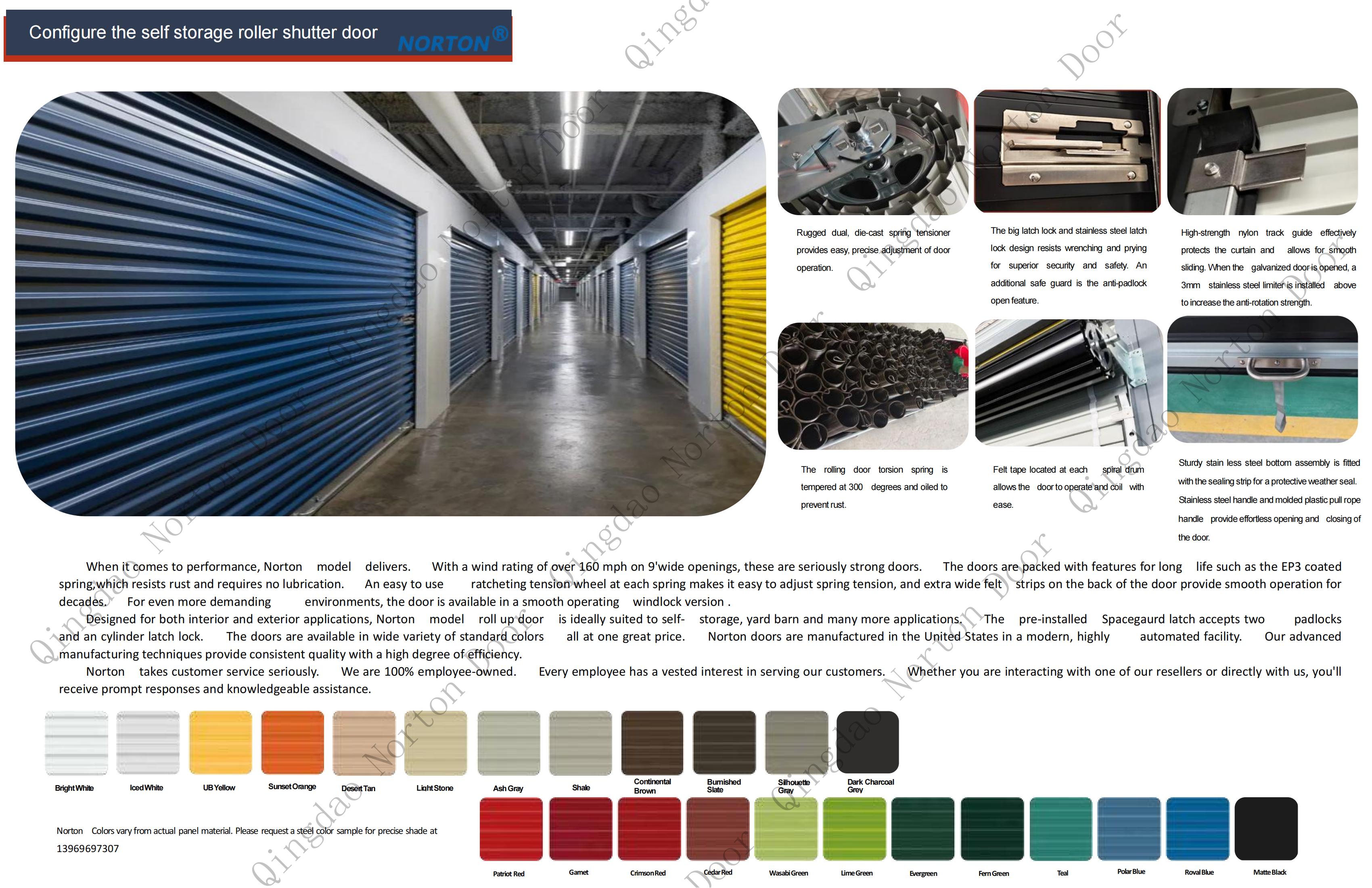 Spoločnosť Qingdao Norton Door Technology Co., Ltd. uprednostňuje spokojnosť zákazníkov a ponúka šité služby pre oceľovú samoobslužnú jednotku s dverami Roll Up. Od dizajnu po inštaláciu a údržbu udržiavame prísnu kontrolu kvality, aby sme zaistili špičkové výrobky a služby. Náš záväzok k dokonalosti a prístupu k zákazníkom nás v priemysle oddeľuje.